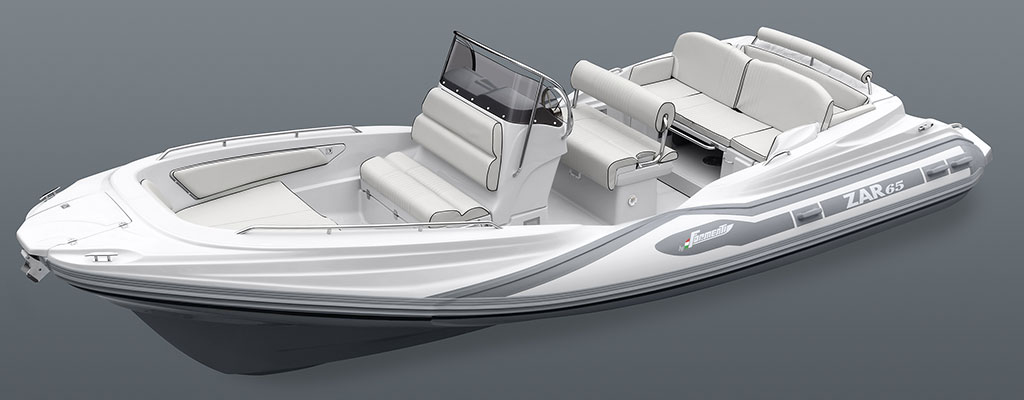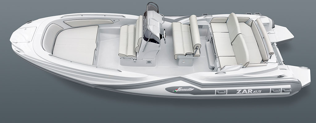 Same features of the classic ZAR 65 Plus improved with white/grey carbon style cushions upholstery, sport driving wheel, swim platforms, switch panel