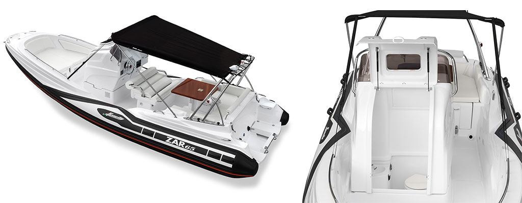 Same features of the classic ZAR 65 Plus improved with white/grey carbon style cushions upholstery, sport driving wheel, swim platforms, switch panel