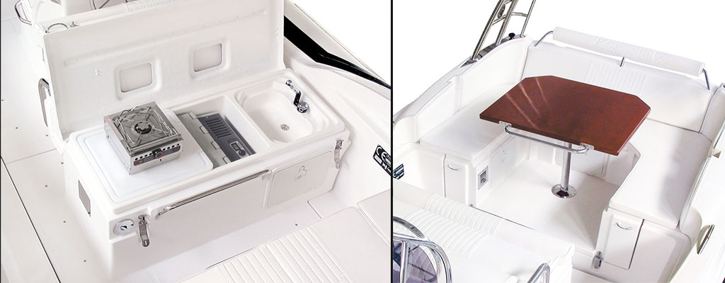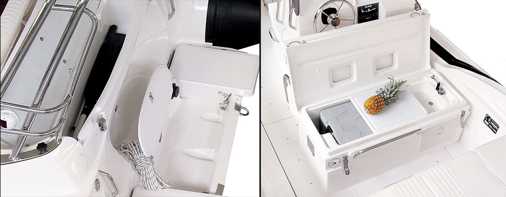 Complete with VTR two-seater drive console with front seat for two and dual peak, driver’s seat with dual peak, rudder and handrail of stainless steel, hydraulic steering, windshield, one indoor compartment, waterproof doors, anatomic seat cushion and seat back for front console seat; anatomic driver’s seat for two permitting driving in a semi-seated position; stainless steel ladder with 2 dashboards on VTR; 4 bollards, 5 stainless steel handles, 2 stainless steel grab rods in prow, 1 stainless steel handrail bumper in prow; stainless steel anchor winch nose with stainless steel shield; 9 kg stainless steel anchor; 3 gas springs for afterpeak and forepeak covers; prow cushion; stern cushion; stern headrest cushion; padded stern backrest divided in 2 sections which may also be used to extend stern sun bed; 3 headrest cushions for prow; tank of about 2×200 lt. installable in accordance with EC regulations (for Plus version: only 1 tank of about 200 lt); repair kit; inflation pump; pressure gauge, paddle oars. Refrigerator special compartiment predisposition, sink with taps predisposition. (All cushions are made of closed cell expanded polyurethane.)