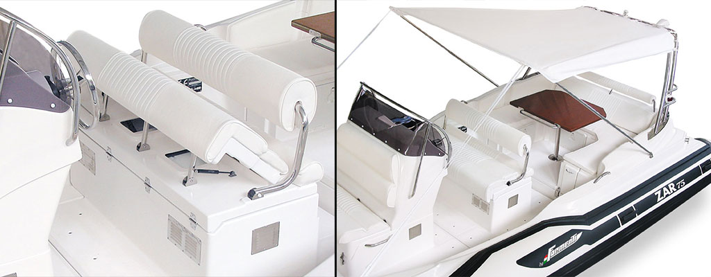 Same features of the classic ZAR 75 improved with white/grey carbon style cushions upholstery, sport driving wheel, swim platforms, switch panel.