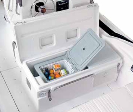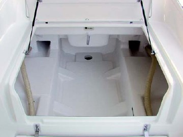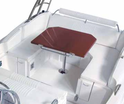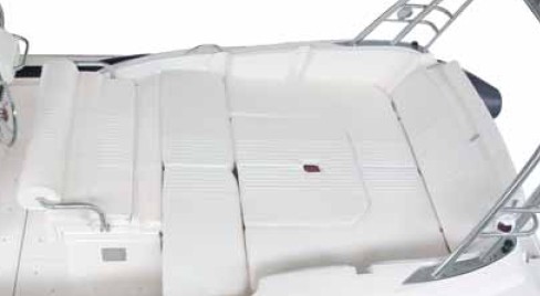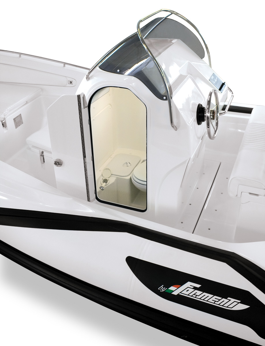 Complete with VTR two-seater drive console with front seat for two and dual peak, driver’s seat with dual peak, rudder and handrail of stainless steel, hydraulic steering, windshield, one indoor compartment, waterproof doors, anatomic seat cushion and seat back for front console seat; anatomic driver’s seat for two permitting driving in a semi-seated position; stainless steel ladder with 2 dashboards on VTR; 4 bollards, 5 stainless steel handles, 2 stainless steel grab rods in prow, 1 stainless steel handrail bumper in prow; stainless steel anchor winch nose with stainless steel shield; 9 kg stainless steel anchor; 3 gas springs for afterpeak and forepeak covers; prow cushion; stern cushion; stern headrest cushion; padded stern backrest divided in 2 sections which may also be used to extend stern sun bed; 3 headrest cushions for prow; tank of about 2×200 lt. installable in accordance with EC regulations (for Plus version: only 1 tank of about 200 lt); repair kit; inflation pump; pressure gauge, paddle oars. Refrigerator special compartiment predisposition, sink with taps predisposition. (All cushions are made of closed cell expanded polyurethane.)